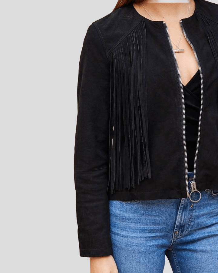 Black Suede Fringe Bomber Leather Jacket