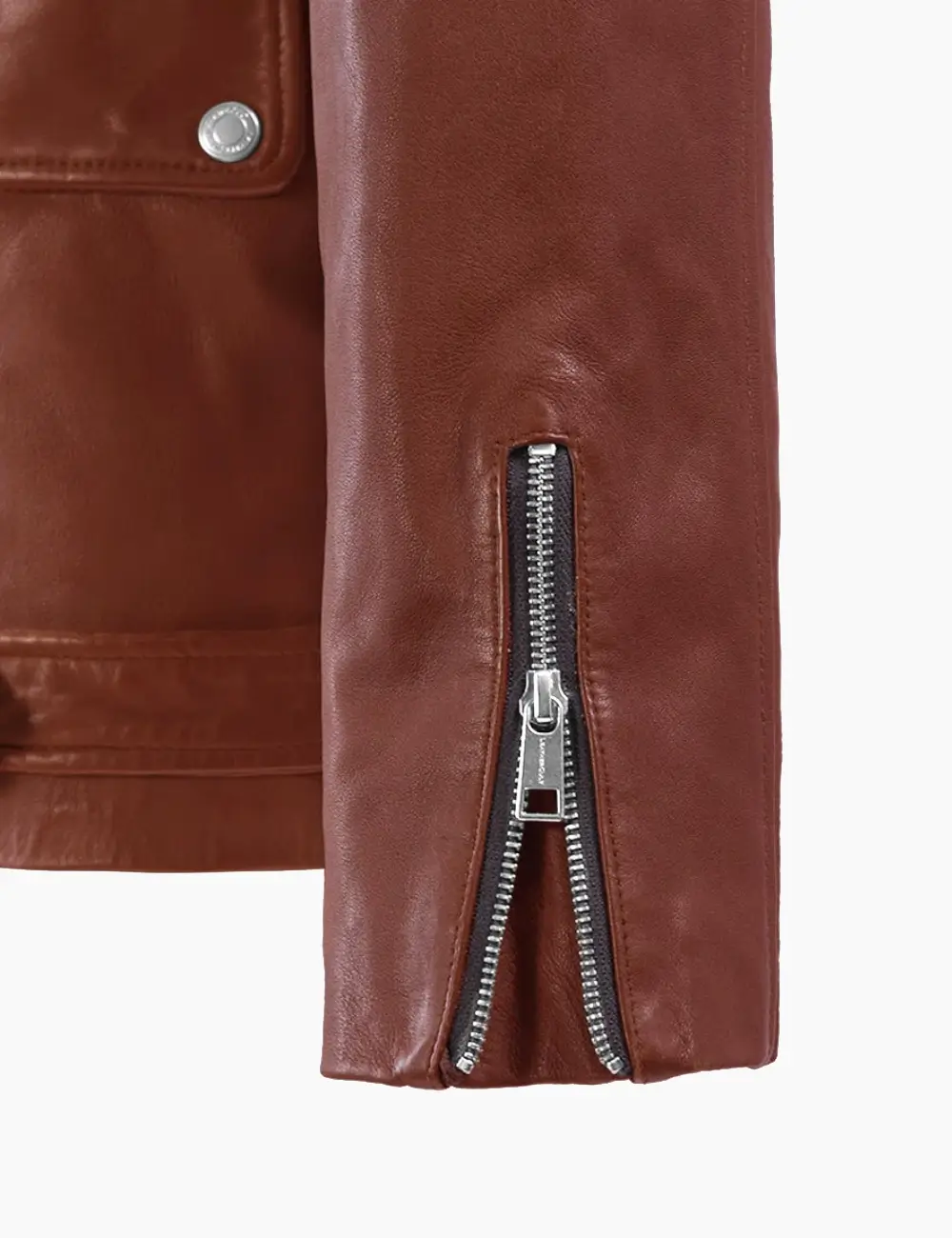 Crafted from high-quality genuine leather, the jacket features a rich canyon brown finish that adds warmth and depth to its overall appearance. The natural leather texture enhances durability while allowing the jacket to age beautifully, developing a unique patina over time that reflects authentic character.